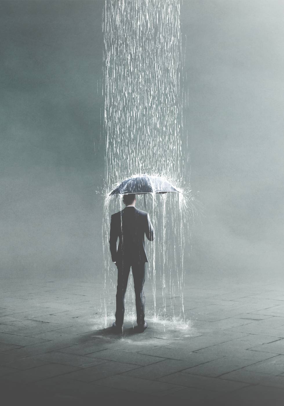 Ein surreales Kunstwerk eines Mannes im Anzug mit Regenschirm, auf den der Regen nur fällt. Der trockene Hintergrund unterstreicht das Gefühl von Einsamkeit und psychischem Druck. Eine starke visuelle Metapher in ruhigen Grautönen.