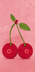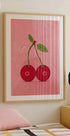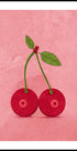 Eine verspielte und lebendige Illustration von zwei Kirschen mit Blättern auf einem strukturierten rosa Hintergrund. Mutig, lustig und farbenfroh – dieses Design bringt einen frischen Hauch von Humor in Küchen, Esszimmer oder moderne Innenräume und ist ein skurriles Statement für alle, die von Früchten inspirierte Kunst lieben.