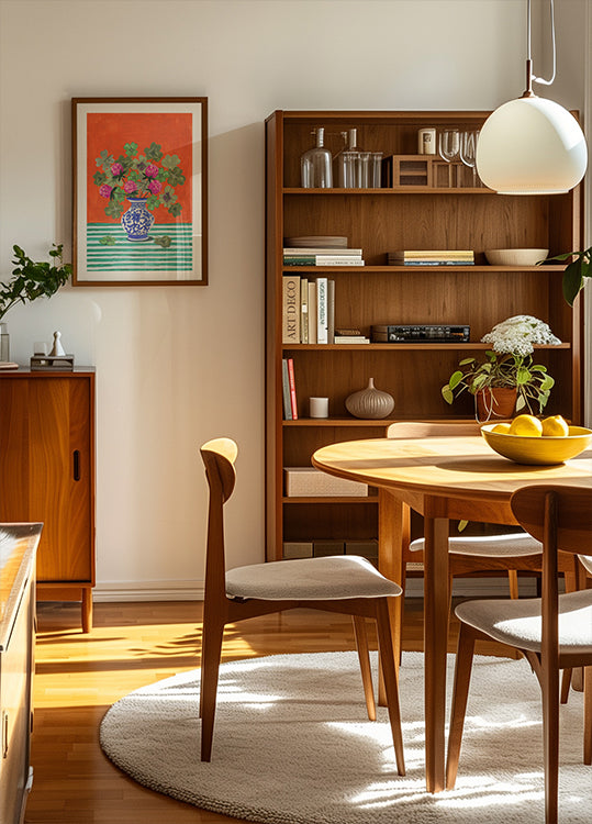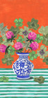 Ein farbenfrohes Stillleben mit einer blauen Porzellanvase voller rosa Blumen und grünen Kleeblättern vor einem kräftig orangefarbenen Hintergrund. Die gestreifte Tischdecke sorgt für einen verspielten Kontrast und macht dieses Stück zu einem lebendigen Deko-Statement. Perfekt für Liebhaber botanischer und moderner Kunst.