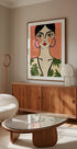 Ein lebendiges und stilvolles Modeporträt-Poster einer Frau mit kräftigen Wimpern, großen Ohrringen und eleganten Farben. Der pfirsichfarbene Hintergrund und die malerischen Texturen verleihen ihm einen modernen künstlerischen Ausdruck und machen ihn zu einem Blickfang in modernen Innenräumen.