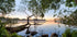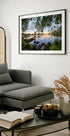Ein ruhiger Naturdruck, der die Stille eines ruhigen Sees bei Sonnenuntergang einfängt, eingerahmt von üppigen grünen Bäumen und glatten Felsen am Ufer. Die spiegelnde Reflexion des Himmels und der Zweige schafft eine friedliche, verträumte Komposition – perfekt, um Schlafzimmern, Wohnzimmern oder anderen von der Natur inspirierten Räumen ein Gefühl der Ruhe zu verleihen.