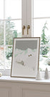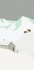 Eine ruhige Winterlandschaft entfaltet sich in einer schneebedeckten Bergstadt, in der Dächer und Tannen im Frost glitzern und warme Fenster vor dem klaren blauen Himmel leuchten. Leichter Schnee fällt auf die Straßen und umrahmt die gemütliche Atmosphäre des Feierns und der Ruhe. Das Motiv stammt von der Künstlerin Nikita Jariwala. Eine stille Hommage an den Frieden und die Präsenz des Winters.