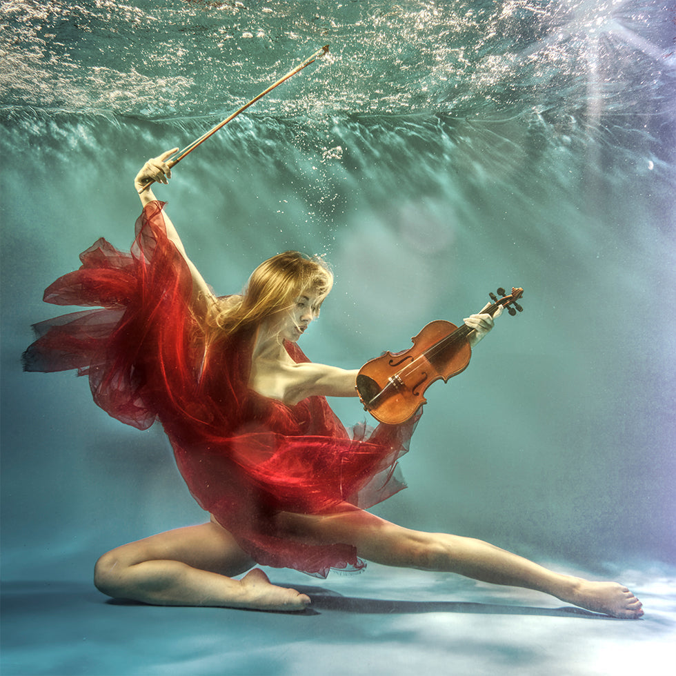 Ein verträumtes Unterwasserporträt, in dem ein Paar in einem Pool schwimmt und zwischen leuchtenden Blasen und wiegenden Blumen Geige spielt. Romantik und Musik verschmelzen zu einem ruhigen Auftakt, der Poesie, Leidenschaft und schwerelose Eleganz ausstrahlt. Fotografie von Uniquecapture, geschaffen, um Emotionen hervorzurufen. Perfekt als zentraler Blickfang im Zuhause.