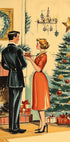 Step into a candlelit, snow-flecked evening where mid-century charm sparkles. A poised woman in a vivid red dress and a dapper gentleman linger by a shimmering Christmas tree, shop windows aglow. Painterly strokes and vintage tones wrap the scene in cozy nostalgia and festive romance. Perfect for creating a warm holiday focal point.