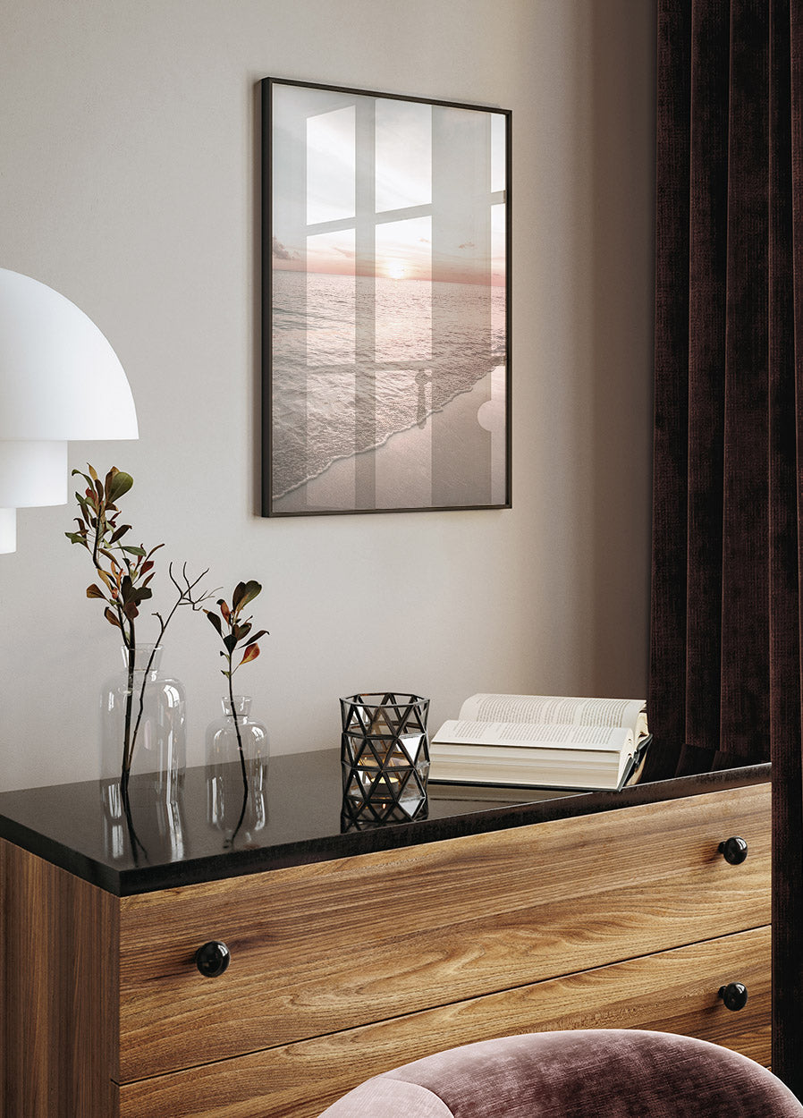 Ein Poster, das einen wunderschönen und ruhigen Strand mit einem rosa Sonnenuntergang zeigt, perfekt, um jedem Raum eine entspannende und ästhetische Atmosphäre zu verleihen.