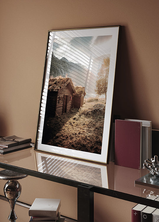 Poster Rustikale Häuser bei Sonnenuntergang von Lovatnet Lake