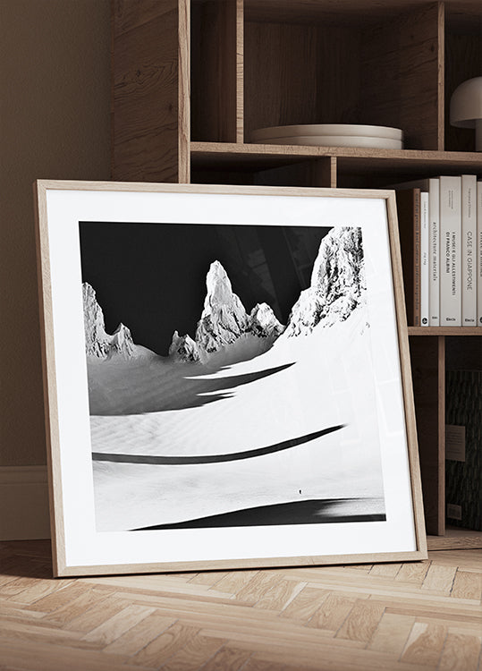 „Klein und groß“ von Åsmund Keilen fängt eine einzelne Skipiste in einer kolossalen, schwarz-weißen Berglandschaft ein. Ein kleiner Skifahrer bewegt sich unter steilen Bergrücken und riesigen Schneeflächen in Norwegen hindurch, wo das Winterlicht die Stille scharf durchschneidet. Eine dramatische Studie über Ausmaß, Mut und nachdenkliche Ruhe, die zu Abenteuer und Nachdenken einlädt.
