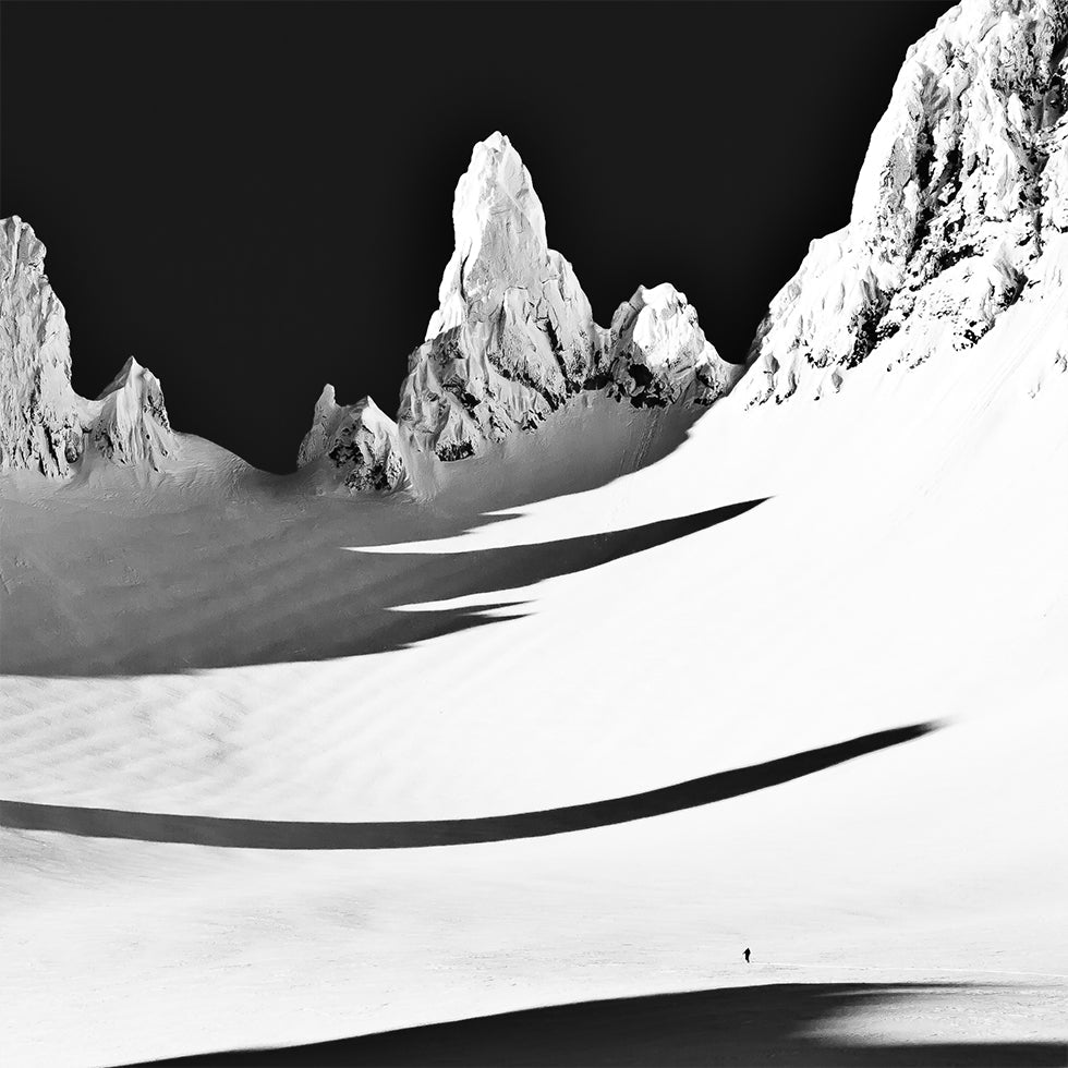 „Klein und groß“ von Åsmund Keilen fängt den Kontrast zwischen Mensch und Natur ein: Ein kleiner Skifahrer bewegt sich über einen schneebedeckten Bergrücken unterhalb monumentaler, schwarz-weißer Berge in Norwegen. Glanzlichter und tiefe Schatten erzeugen grafische Ruhe, frostige Stille und ein zeitloses Gefühl von Abenteuer und hohen Bergen. Inspirierend für zu Hause und für alle, die das ruhige Drama des Winters genießen.