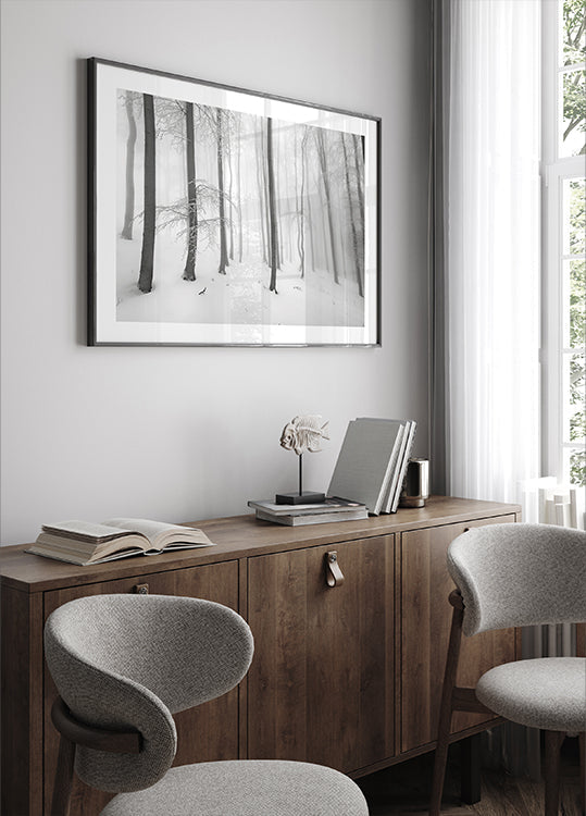 In Nebel und Frost entfaltet sich eine stille Winterlandschaft, in der schlanke Buchenstämme als grafische Linien in einem gedämpften, verschneiten Waldraum stehen. Das Licht wird sanft durch den Dunst gefiltert und erzeugt einen meditativen Blickfang, der die Ruhe zwischen den Bäumen einfängt. Eine poetische Naturfotografie von Tom Pavlasek. Perfekt für eine winterliche Atmosphäre im Zuhause.