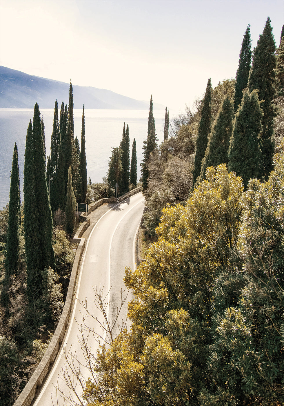 Eine malerische, kurvenreiche Straße, umgeben von hohen Zypressen und üppigem Grün, nahe dem Ufer des Gardasees in Italien. Das glitzernde Wasser erstreckt sich bis zum Horizont und reflektiert das helle Sonnenlicht und die fernen Hügel. Dieses eindrucksvolle Bild fängt den Charme der italienischen Küste ein und lädt Sie ein, die ruhige Schönheit des Gardasees zu erkunden.
