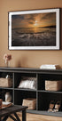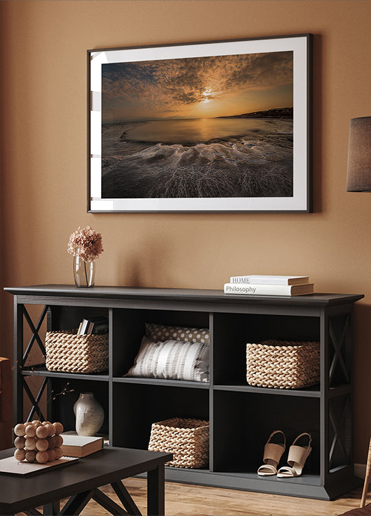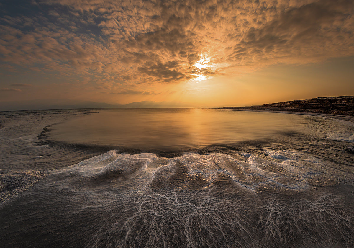 Isam Telhamis Struktur aus Salz lässt den ruhigen Rhythmus des Meeres den Raum erfüllen: Sanfte Wellen spülen über feinen, hellen Sandstrand, wo das Salz subtile Muster entlang der Wasserkante zeichnet. Über dem Horizont ziehen schwere Wolken in gedämpften Blau- und Sandtönen. Ein ruhiges, minimalistisches Motiv, das zum Nachdenken einlädt.