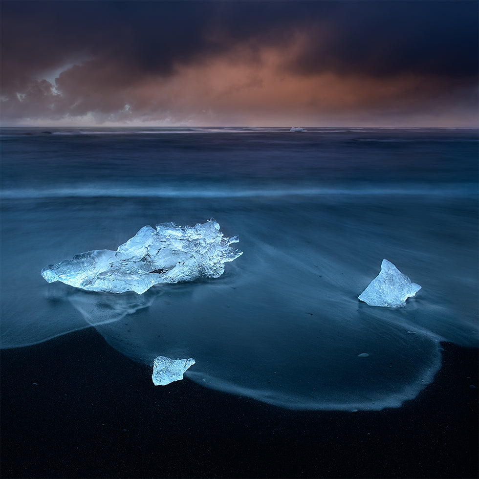 Iskrystaller gløder på Islands sorte sand, mens bløde, tågede bølger stryger forbi i en rolig lang eksponering. Horisonten opløses i vinterlys, og skaber en meditativ stemning af stilhed og drama. Et minimalistisk, nordisk havlandskab fotograferet af Shenshen Dou ved Diamond Beach. Et billede af islandsk vintermagi, skabt til ro og fordybelse.