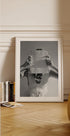 Ein auffälliges Schwarz-Weiß-Modefoto, das eine Frau zeigt, die ein Vogue Italia-Magazin vor ihrem Gesicht hält, eine übergroße Halskette und ein strukturiertes Outfit trägt. Das Kunstwerk fängt die Mystik und Faszination der Modewelt ein, eine Mischung aus Anonymität und kühnem Stil. Perfekt für moderne Innenräume und modeinspirierte Galeriewände.