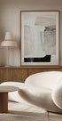 Ein minimalistisches abstraktes Poster von Dan Hobday mit sanften Pinselstrichschichten in neutralen Tönen. Die strukturierten Formen ergeben eine ausgewogene und moderne Komposition, perfekt für moderne Innenräume, skandinavisches Design oder als Teil einer beruhigenden Bilderwand.