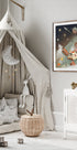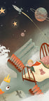 Eine magische und skurrile Illustration eines Kindes, das auf einem Bett durch das Universum fliegt und sich in einen Vogel mit Krone verwandelt. Umgeben von Sternen, Planeten, Raketen und Traumschiffen am Nachthimmel fängt das Werk die Fantasie und Träume der Kindheit ein.
