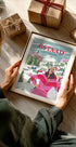 Tauchen Sie ein in den Winterglamour von Gstaad mit dem stilvollen Poster von Caroline Bonne Müller: Eine selbstbewusste Frau in einem leuchtend rosa Monosuit und einer verspiegelten Brille betrachtet schneebedeckte Tannen und Chaletdächer, während die Alpen in der tiefstehenden Wintersonne leuchten. Vintage-inspirierte Typografie verleiht der Szene einen schicken, zeitlosen Reise-Look. Perfekt zum Träumen von Pisten, Zirben und Après-Ski.