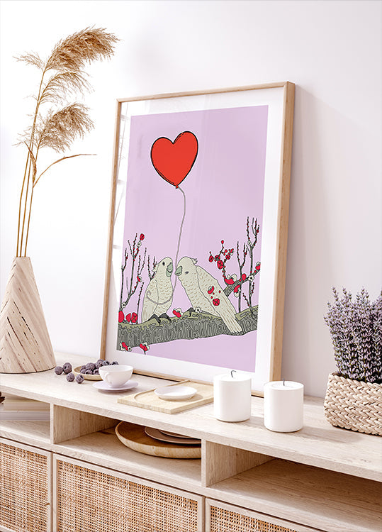 To farverige fugle sidder tæt på en slank gren omgivet af lyserøde blomster, mens en rød hjerteballon svæver over dem. Den blide pastelbaggrund og grafiske, nordiske streg skaber ro og romantik i rummet. En poetisk forårsfortælling, smukt illustreret af Nicholas. Lyset flimrer gennem blomsterne, og fuglenes bløde farver emmer af forår og kærlighed.