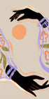 Eine moderne figurative Illustration zweier schwarzer Hände, die einer leuchtend orangefarbenen Sonne entgegengreifen. Die Ärmel sind mit floralen Ärmeln in sanften Pastelltönen verziert, die eine poetische Mischung aus botanischer Schönheit und abstraktem Minimalismus schaffen. Das Werk symbolisiert Harmonie, Energie und Verbundenheit zur Natur.