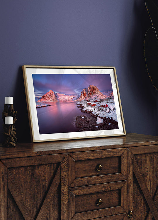 En stille, vinterlig scene fra Lofoten, indfanget af fotografen David Martin Castan: sneklædte tinder rejser sig over en frossen sø, hvor glatte sten og isflager samler blikket i forgrunden. Lang eksponering gør vandet silkeblødt og giver landskabet et koldt, drømmende, tidløst udtryk. Horisonten dæmpes i milde, mælkede toner.