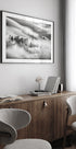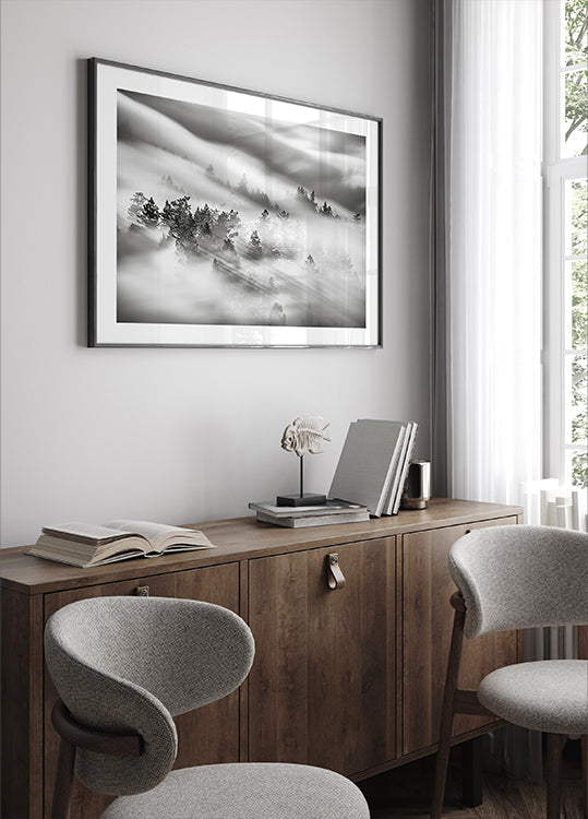 En tidløs, monokrom landskabsscene af Johnny Zhang: tåge svæver mellem snedækkede bjergsider og mørke fyrretræer, hvor himmel og horisont smelter sammen i stille ro. Kontrasterne er bløde, linjerne rene, og motivet indfanger vinterens poesi—et fredfyldt fokuspunkt til rum, der søger balance og dybde.