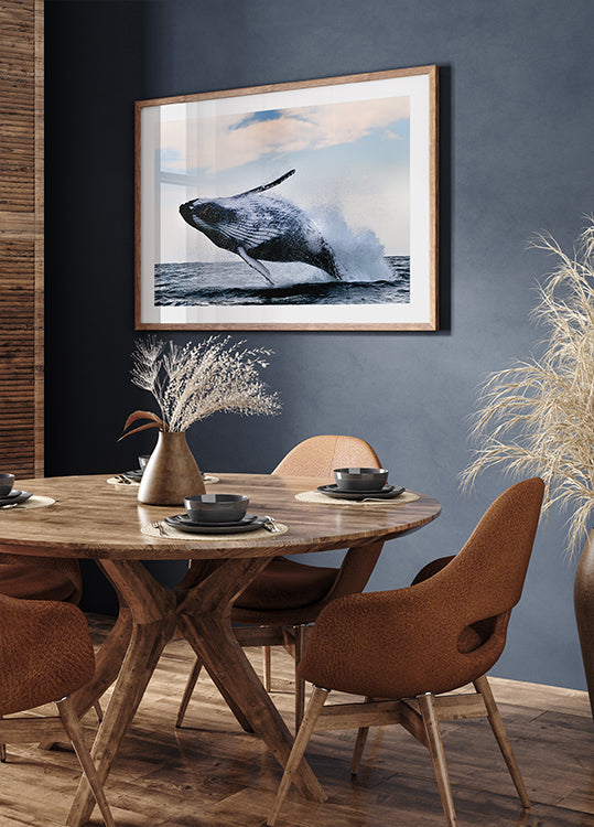 Ein atemberaubendes Fotoposter, das einen Buckelwal einfängt, der dramatisch über der Meeresoberfläche bricht. Der kraftvolle Sprung, gefangen in der Luft mit spritzendem Wasser, zeigt die majestätische Kraft der Natur. Perfekt für Tierliebhaber, Meeresliebhaber und alle, die die beeindruckenden Wunder der Natur lieben.