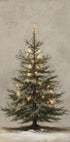 Ein sanft bemalter Weihnachtsbaum im Vintage-Stil steht in ruhigem Winterlicht mit kleinen goldenen Lichtern zwischen den tiefgrünen Zweigen. Der neutrale, strukturierte Hintergrund und ein leichter Hauch von Schnee verleihen dem Motiv eine ruhige und nostalgische Weihnachtsatmosphäre – perfekt für gemütliche saisonale Dekorationen, klassische Galeriewände oder skandinavische Häuser.