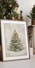 Ein gemütlicher, immergrüner Baum im Vintage-Stil steht leicht mit Schnee bedeckt, während warme goldene Lichter zwischen den Zweigen funkeln. Der gedämpfte, papierstrukturierte Hintergrund und der sanfte Schneefall schaffen eine ruhige und nostalgische Weihnachtsatmosphäre – ideal für eine klassische saisonale Bilderwand oder eine einfache Winterecke.