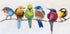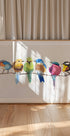 Ein verspieltes und malerisches Kunstwerk von sechs bunten Vögeln, die zusammen auf einem Ast sitzen. Jeder Vogel ist einzigartig mit kräftigen blauen, grünen, gelben, roten und braunen Strichen bemalt, wodurch eine lebendige und ausdrucksstarke Komposition entsteht. Perfekt, um jeder Wand Charme und Kreativität zu verleihen.