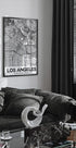 Feiern Sie die Stadt der Engel mit einem klaren monochromen Statement: Los Angeles in kräftiger schwarzer Typografie vor reinem Weiß, akzentuiert durch subtile Linien und geometrische Elemente, die Straßen, Häuserblöcke und den Rhythmus der Skyline widerspiegeln. Minimal, retro-orientiert und urban – es ist eine zeitlose Anspielung auf Reisen, Nostalgie und Stadtstolz.