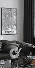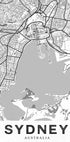 Eine klare Schwarz-Weiß-Karte von Sydney, auf der sich das Straßennetz und die gewundene Küste der Stadt in scharfen Linien und feinen Details entfalten. Die Silhouette des Hafens und die markanten Stadtteile stechen deutlich hervor, während die dezente Textur ein dezentes Vintage-Feeling vermittelt – perfekt sowohl für moderne als auch Retro-Innenarchitektur im Zuhause.