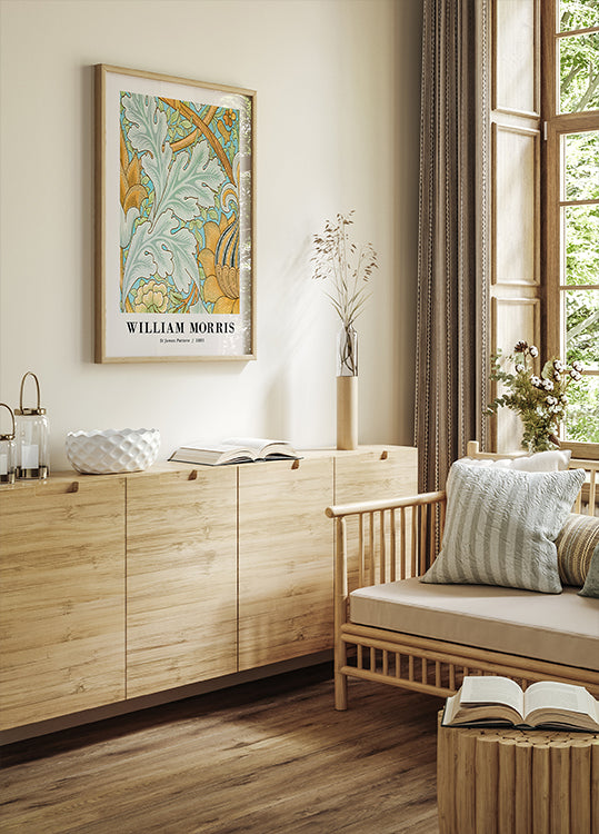 Ein farbenfrohes und kunstvolles Muster von William Morris. Das St. James-Muster (1881) besticht durch elegante Akanthusblätter, stilisierte Blüten und sanfte Linien in Mintgrün, Ocker und Hellblau. Ein hervorragendes Beispiel für Morris' Fähigkeit, die Schönheit der Natur in harmonisches Design umzusetzen.