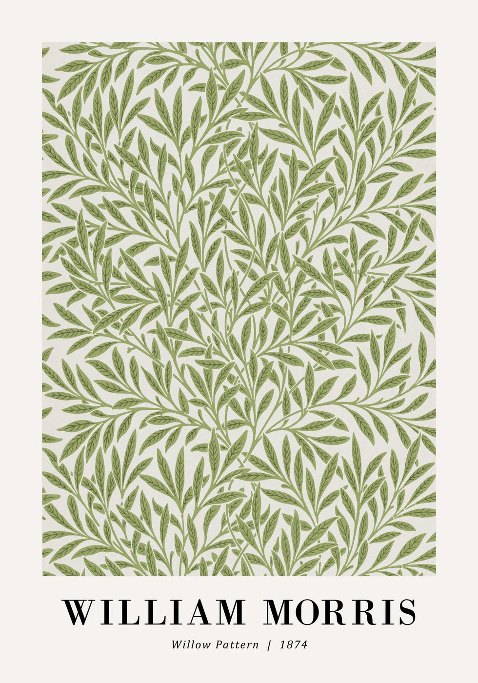 Ein zeitloses botanisches Poster mit dem ikonischen Weidenmuster, entworfen von William Morris im Jahr 1874. Die zarten grünen Blätter bilden ein faszinierendes, von der Natur inspiriertes Muster, das den Stil der Arts-and-Crafts-Bewegung perfekt einfängt. Ideal für alle, die Vintage-Design, klassische Handwerkskunst und natürliche Muster lieben.