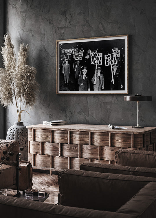 Ein bemerkenswertes Schwarz-Weiß-Vintage-Foto, das einen historischen Protest während der Prohibitionszeit festhält. Demonstranten hielten Schilder mit der Aufschrift „Wir wollen Bier“ hoch – ein starkes Symbol für die Nachfrage der Bevölkerung nach Alkohol im frühen 20. Jahrhundert. Perfekt für Geschichtsinteressierte, Vintage-Fotografie und einzigartige Bar-Dekoration.