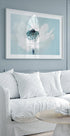 Eine zarte Makrofotografie einer weißen Blume mit türkisfarbenen Details, die eine verträumte und ätherische Stimmung erzeugen. Der weiche Fokus und die Pastellfarben strahlen Ruhe und Eleganz aus und machen das Werk ideal für Innenräume, die Harmonie und raffinierte Schönheit suchen.